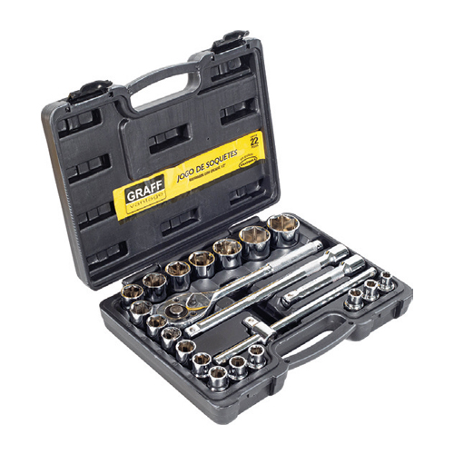 | Jogo com 22 Peças | 1 Catraca Reversível com encaixe 1/2″; 1 Cabo T; 2 Extensões (5″ e 10″); 18 Soquetes Estriados com encaixe 1/2″ (8,0 – 9,0 – 10,0 – 11,0 – 12,0 – 13,0 – 14,0 – 15,0 – 16,0 – 17,0 – 18,0 – 19,0 – 21,0 – 22,0 – 24,0 – 27,0 – 30,0 – 32,0mm). |