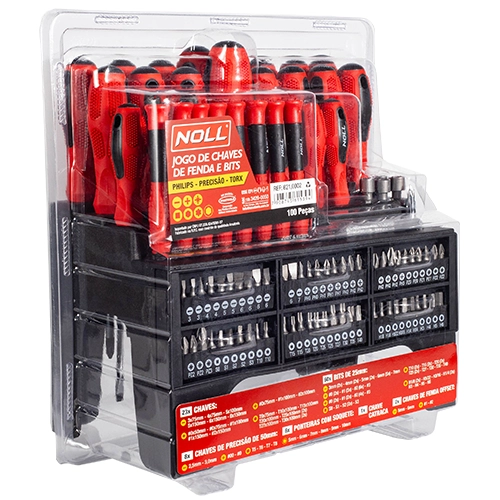 | Jogo com 100 peças | 23 Chaves: SL: 3×75, 4×75, 5×100, 5×150, 6×150 e 8x150mm. PH: #0x50, #0x75, #1×100, #1×150 e #2×150. PZ: #0x75, #1×100, #2x100mm. T: 9×75, 10×100, 15×100, 20×100, 25×100 (2x), 27×100 e 30x100mm (2x). 8 Chaves de Precisão de 50mm: SL: 2.5mm e 3.0mm. PH: #00 e #0. T: 5, 6, 7 e 8mm. 1 Chave Catraca; 2 Chaves de Fenda Offset: SL5 e PH#1, SL6 e PH#2. 6 Ponteiras com Soquete: 5, 6, 7, 8, 9 e 10mm. 60 Bits 25mm: SL 3.0mm (2x), 4mm (2x), 5mm (2x), 6mm (5x) e 7mm. PH: #0 (2x), #1 (3x), #2 (6x), e #3. PZ: #0 (2x), #1 (2), #2 (4x) e #3. S0, S1 (ex) e S3. T: 10 (2x), 15 (2x), 20 (2x), 25 (2x), 27, 30, 35 e 40. HEX: 1/8″ (2x), 5/32″, 3/16″, 1/4″ (2x), 3, 4, 5 e 6mm. |